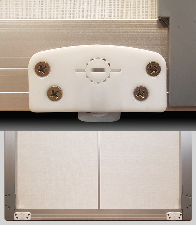 2) 높낮이 조절 방법 | ▪ㅡ자 드라이버를 이용하여 가운데 ㅡ부분을 오른쪽이나 왼쪽으로 한크릭씩 돌려주면 1mm씩 최대 3-4mm까지 조절 됩니다. ▪도어 하단 부분과 하부 레일의 간격이 2-3mm정도 되어야 슬라이딩 도어가 부드럽게 움직일 수 있습니다. |